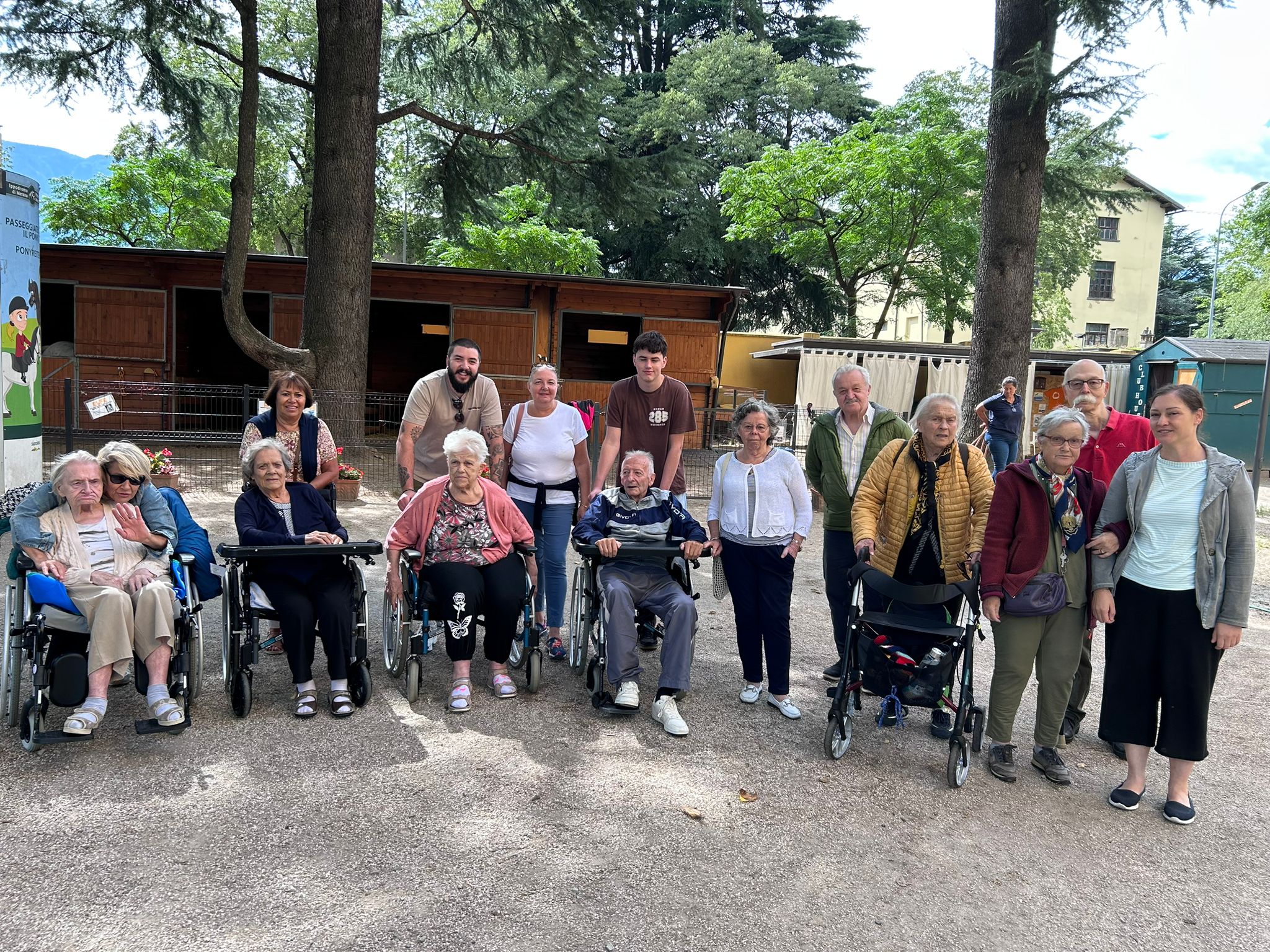 Ein Ausflug führte die Senior*innen des Eden zur Pferderennbahn, wo sie auf Einladung von Frau Barbara, Reitlehrerin und Leiterin des Ponyclubs HoppiGaloppi, an einer Ponystunde teilnehmen konnten. Mit Hilfe einer Gruppe von Mädchen, die während der Sommermonate an den Kursen teilnehmen, konnten sie beobachten, wie sanftmütig und liebevoll Ponys sind. Sie erklärte auch, dass die Gangarten des Ponys Schritt, Trab und Galopp sind. Frau Barbara beantwortete einige Fragen unserer Bewohner, insbesondere jene, wie man sich einem Pony nähern kann, ohne es zu erschrecken. Pferde haben, was ihr Sehvermögen betrifft, zwei blinde Flecken, das heißt sie sehen direkt vor ihrer Schnauze und hinter ihren Schultern nichts. Daher sollte man sich niemals von hinten nähern, da man einen Tritt riskiert. Wenn man sie füttern möchte, sollte man sie erst am Futter riechen lassen, da sie es dann anhand ihres Geruchssinns erkennen und fressen. Dann stellte Frau Barbara uns das älteste Pony ihres Stalls vor, es heißt Pinky, aber für seine Freunde ist es Pinkele. Es ließ sich streicheln und bekam auch ein paar Stückchen Karotte und Apfel. Am Ende des Besuchs machten wir ein Gruppenfoto, bedankten uns bei Frau Barbara für den schönen Tag und gingen alle zusammen einen Kaffee trinken.