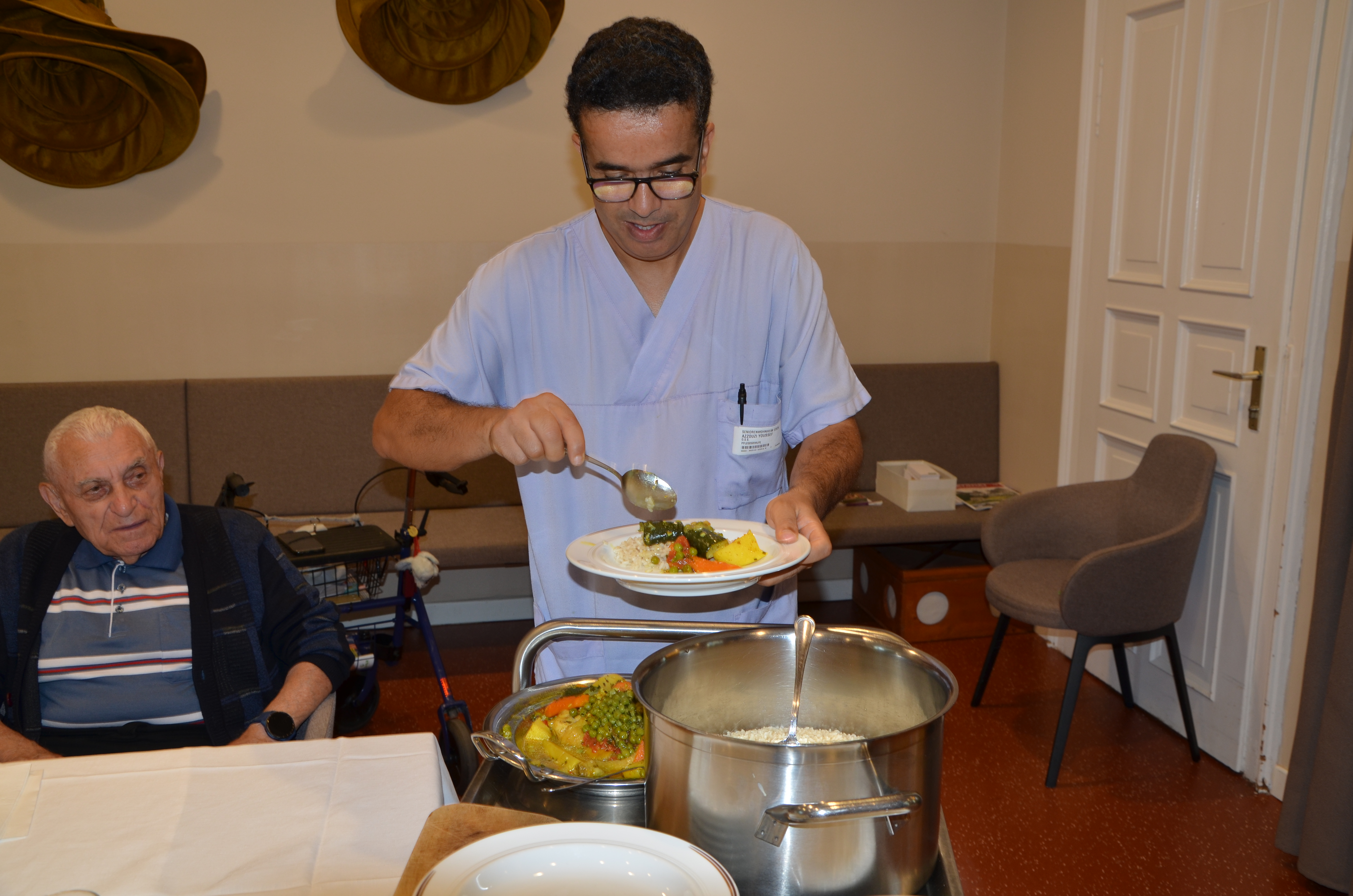 Grazie al nostro assistente Youssef, abbiamo avuto di nuovo l’occasione di assaporare una pietanza a base di pollo, verdure e spezie cucinate in una pentola in terracotta chiamata „ TAJINE“ con il coperchio a forma di cono che trattiene il calore per una lunga cottura tipica del suo paese d’origine: il Marocco. Un gruppo di anziani ha partecipato a questa speciale serata, incominciata già nel primo pomeriggio. Con il loro aiuto abbiamo preparato gli ingredienti tagliando le verdure, tritando il prezzemolo e spremuti i limoni, mentre Youssef si occupava di preparare il pollo. Ora tutto era pronto per procedere con la cottura della pietanza nella Tajine Nel frattempo, ci siamo dedicati a preparare la tavola. Una lunga tavolata pronta ad accogliere gli ospiti che non vedevano l’ora di assaggiare la pietanza: un delizioso pollo speziato con verdure saporite accompagnato da un riso al vapore. Gli ospiti hanno apprezzato sia il cibo che la compagnia e ringraziano di cuore Youssef per la possibilità di poter conoscere attraverso odori e sapori la cucina della sua terra natia.